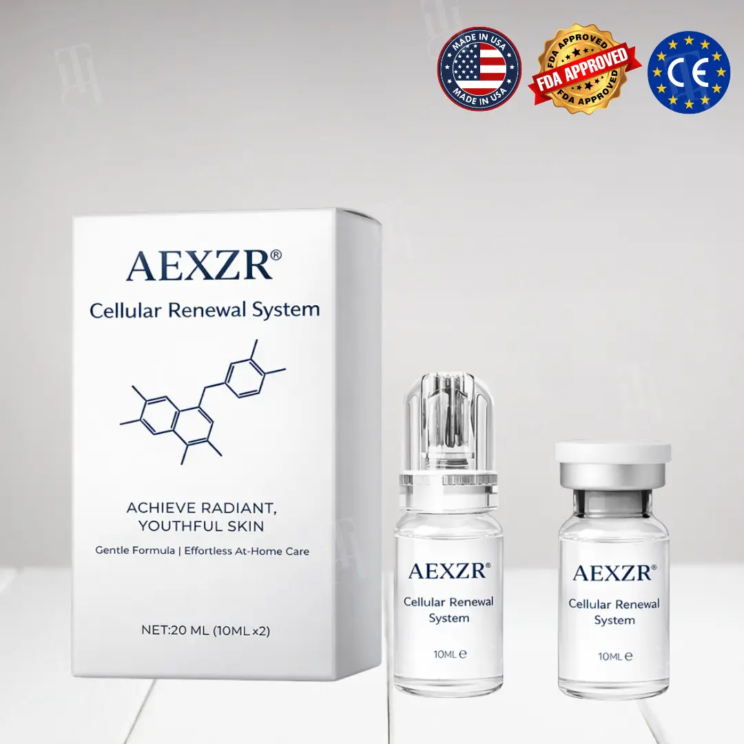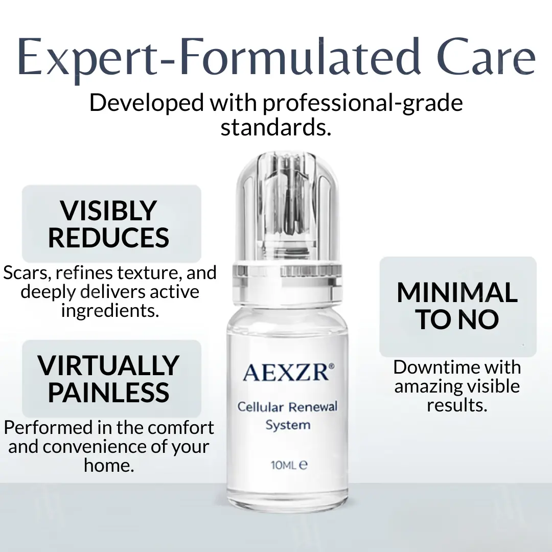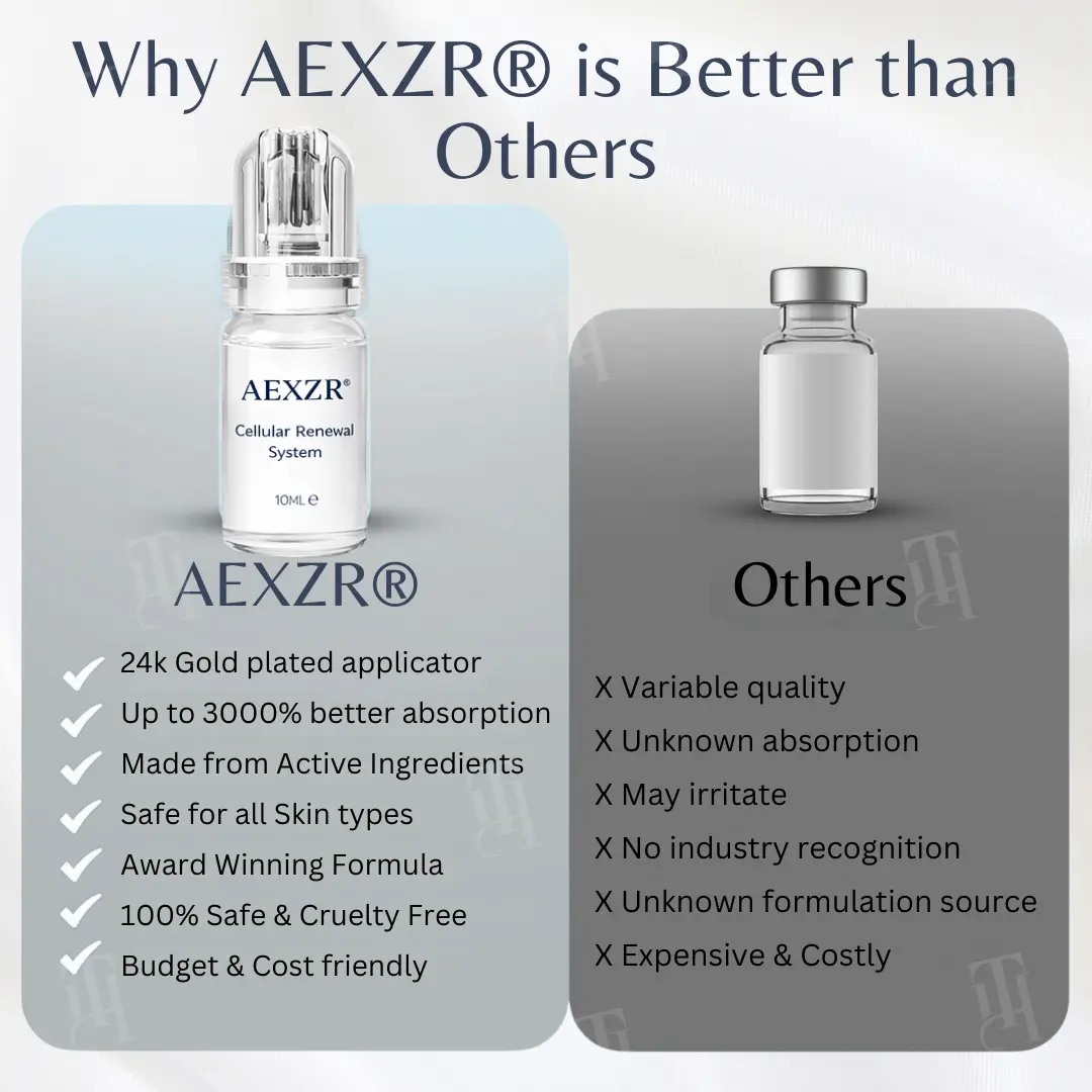 The AEXZR® Way: Our 24k Gold-Plated Stamp uses Hollow Microneedles connected to an airless pump. As you press, the serum is injected directly into the dermis. No tearing. Just surgical precision.