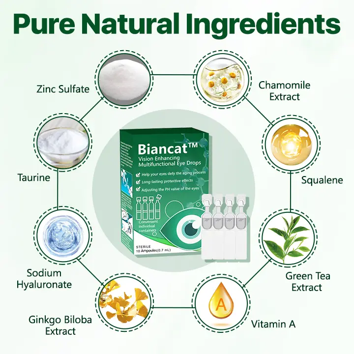 Biancat® Vision Enhancing Multifunctional Eye Drops is a specialized eye care solution formulated to address and alleviate various eye conditions such as presbyopia, cataracts, glaucoma, dry eyes, diabetic retinopathy, and pterygium. Our eye drops blend a range of natural ingredients to ensure both safety and efficacy, helping you restore clear vision.