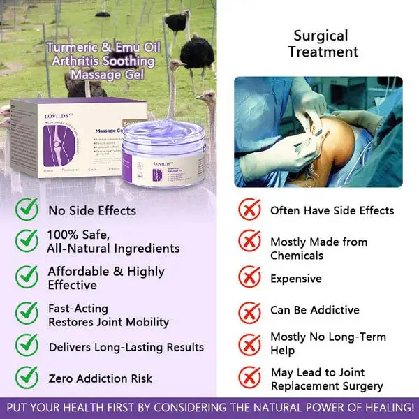 As an orthopedic surgeon, I highly recommend LOVILDS™ Turmeric & Emu Oil Arthritis Soothing Massage Gel for individuals dealing with joint pain, osteoarthritis, rheumatoid arthritis, and other inflammatory conditions. This gel combines the potent anti-inflammatory properties of turmeric and emu oil, working together to reduce pain, ease inflammation, and support joint health. Beyond, it also promotes tissue regeneration and aids in long-term joint recovery. Its unique formula helps repair damaged cartilage and supports overall mobility, offering lasting relief and improved joint function.